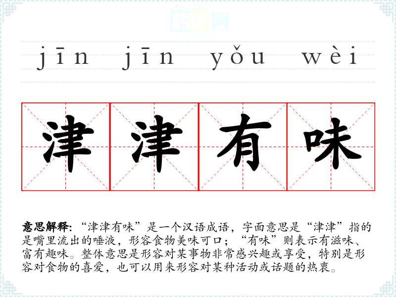 “津津有味”是一个汉语成语,字面意思是“津津”指的是嘴里流出的唾液,形容食物美味可口;“有味”则表示有滋味、富有趣味。整体意思是形容对某事物非常感兴趣或享受,特别是形容对食物的喜爱,也可以用来形容对某种活动或话题的热衷。