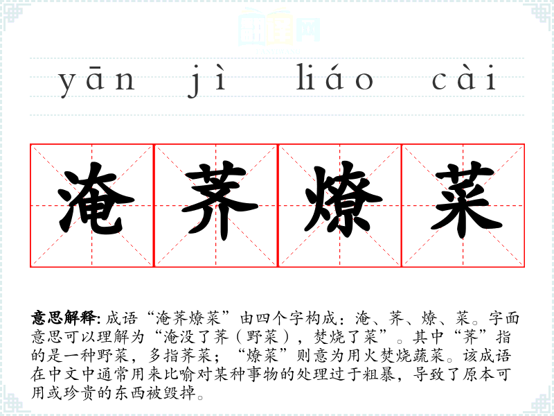成语“淹荠燎菜”由四个字构成:淹、荠、燎、菜。字面意思可以理解为“淹没了荠(野菜),焚烧了菜”。其中“荠”指的是一种野菜,多指荠菜;“燎菜”则意为用火焚烧蔬菜。该成语在中文中通常用来比喻对某种事物的处理过于粗暴,导致了原本可用或珍贵的东西被毁掉。