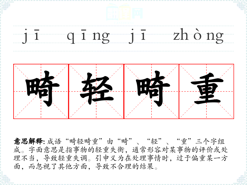 成语“畸轻畸重”由“畸”、“轻”、“重”三个字组成。字面意思是指事物的轻重失衡,通常形容对某事物的评价或处理不当,导致轻重失调。引申义为在处理事情时,过于偏重某一方面,而忽视了其他方面,导致不合理的结果。