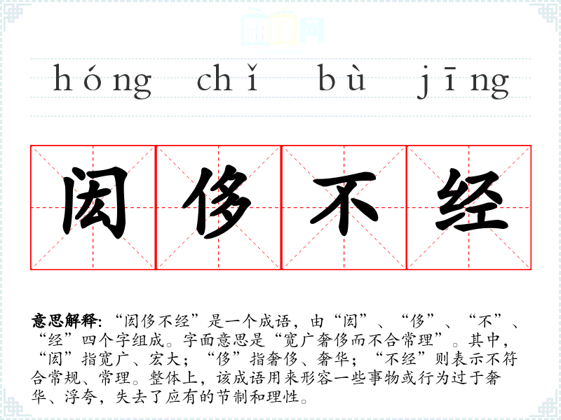 | 闳侈不经 | 指不着边际,不合常理;近乎荒诞,没有根据。同“闳大不经”。 |