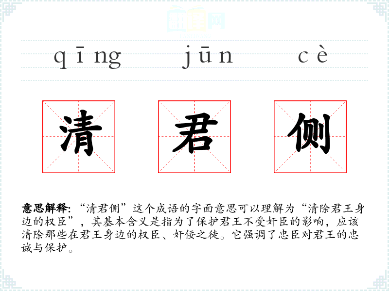 “清君侧”这个成语的字面意思可以理解为“清除君王身边的权臣”,其基本含义是指为了保护君王不受奸臣的影响,应该清除那些在君王身边的权臣、奸佞之徒。它强调了忠臣对君王的忠诚与保护。