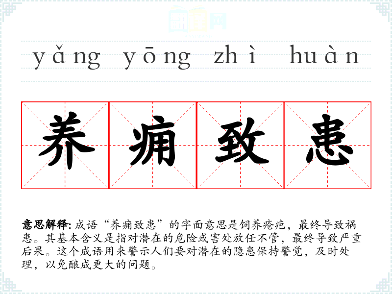 成语“养痈致患”的字面意思是饲养疮疤,最终导致祸患。其基本含义是指对潜在的危险或害处放任不管,最终导致严重后果。这个成语用来警示人们要对潜在的隐患保持警觉,及时处理,以免酿成更大的问题。