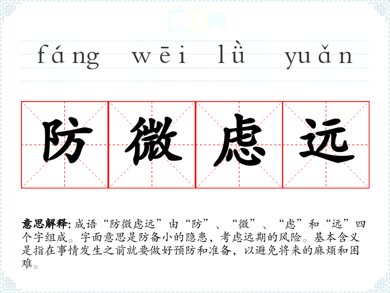 成语“防微虑远”由“防”、“微”、“虑”和“远”四个字组成。字面意思是防备小的隐患,考虑远期的风险。基本含义是指在事情发生之前就要做好预防和准备,以避免将来的麻烦和困难。