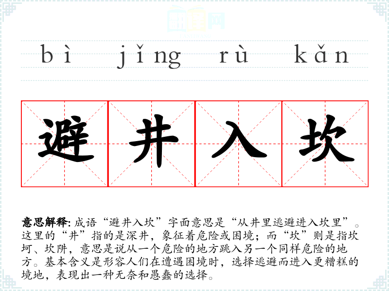 成语“避井入坎”字面意思是“从井里逃避进入坎里”。这里的“井”指的是深井,象征着危险或困境;而“坎”则是指坎坷、坎阱,意思是说从一个危险的地方跳入另一个同样危险的地方。基本含义是形容人们在遭遇困境时,选择逃避而进入更糟糕的境地,表现出一种无奈和愚蠢的选择。