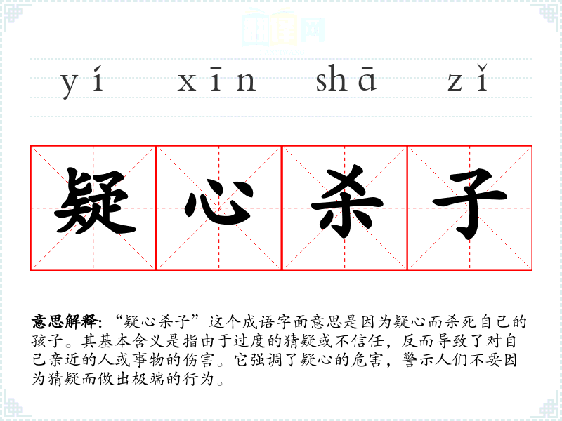 “疑心杀子”这个成语字面意思是因为疑心而杀死自己的孩子。其基本含义是指由于过度的猜疑或不信任,反而导致了对自己亲近的人或事物的伤害。它强调了疑心的危害,警示人们不要因为猜疑而做出极端的行为。