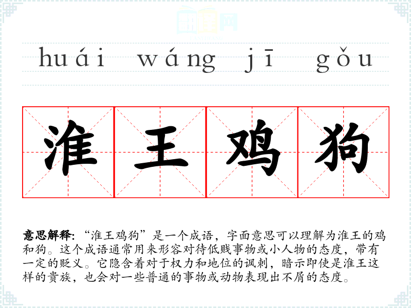 “淮王鸡狗”是一个成语,字面意思可以理解为淮王的鸡和狗。这个成语通常用来形容对待低贱事物或小人物的态度,带有一定的贬义。它隐含着对于权力和地位的讽刺,暗示即使是淮王这样的贵族,也会对一些普通的事物或动物表现出不屑的态度。