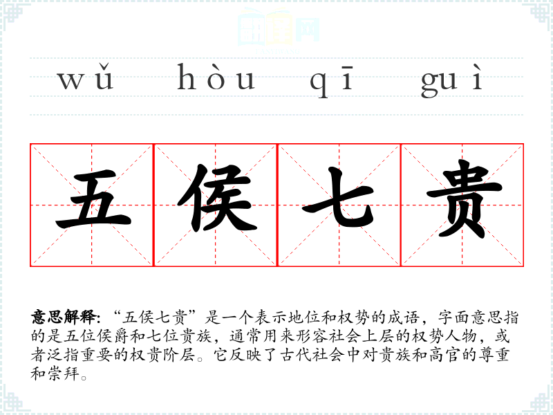 “五侯七贵”是一个表示地位和权势的成语,字面意思指的是五位侯爵和七位贵族,通常用来形容社会上层的权势人物,或者泛指重要的权贵阶层。它反映了古代社会中对贵族和高官的尊重和崇拜。
