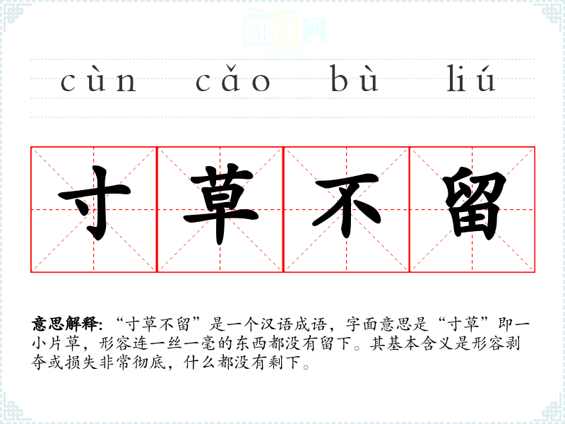 - 在文学作品中,常用“寸草不留”形容战火带来的破坏。