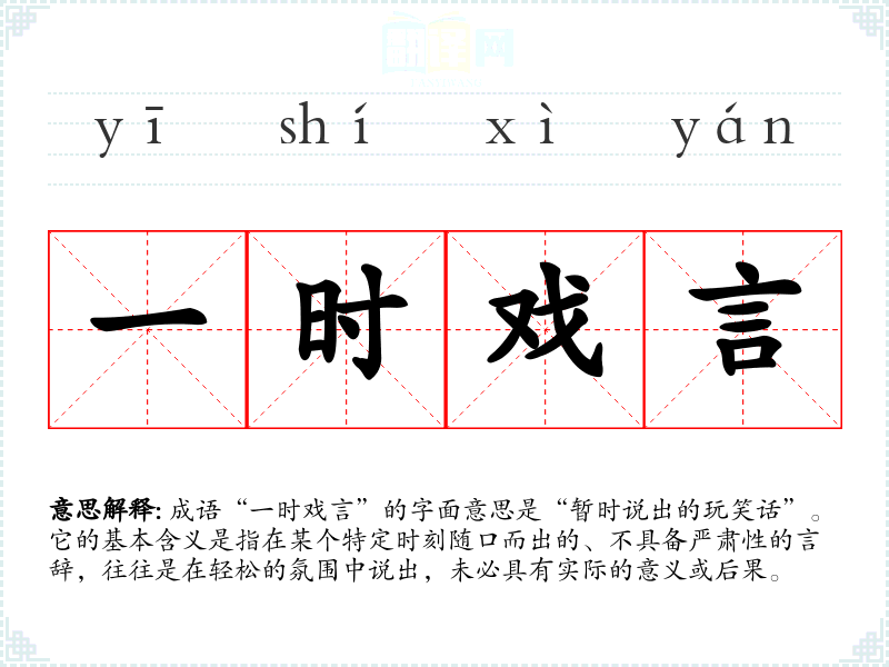 成语“一时戏言”的字面意思是“暂时说出的玩笑话”。它的基本含义是指在某个特定时刻随口而出的、不具备严肃性的言辞,往往是在轻松的氛围中说出,未必具有实际的意义或后果。