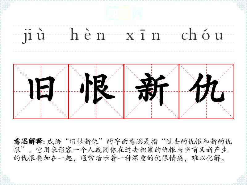 成语“旧恨新仇”的字面意思是指“过去的仇恨和新的仇恨”。它用来形容一个人或团体在过去积累的仇恨与当前又新产生的仇恨叠加在一起,通常暗示着一种深重的仇恨情感,难以化解。