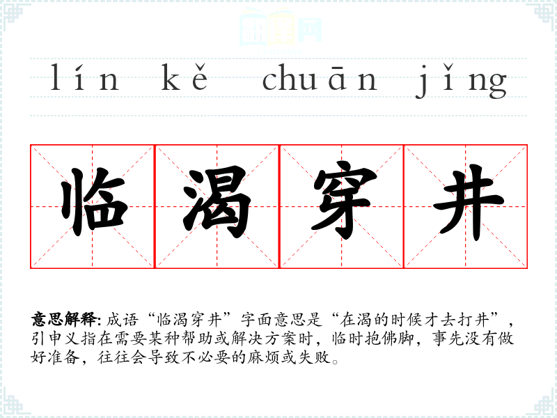 成语“临渴穿井”字面意思是“在渴的时候才去打井”,引申义指在需要某种帮助或解决方案时,临时抱佛脚,事先没有做好准备,往往会导致不必要的麻烦或失败。