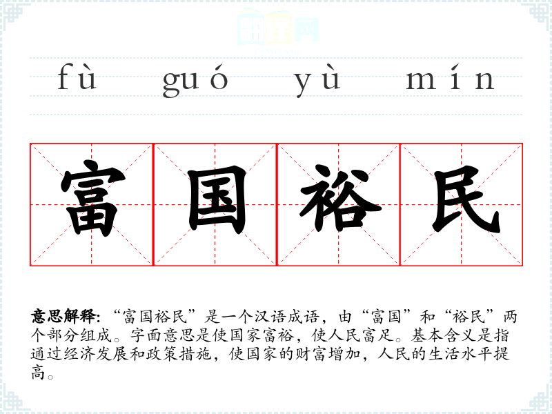 “富国裕民”是一个汉语成语,由“富国”和“裕民”两个部分组成。字面意思是使国家富裕,使人民富足。基本含义是指通过经济发展和政策措施,使国家的财富增加,人民的生活水平提高。