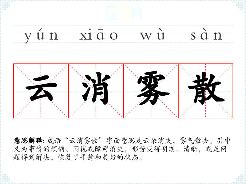 在**传统文化中,自然景象常常与人的情感和命运相联系。云和雾的变化象征着人生的起伏与无常,因此“云消雾散”在文化中不仅是一种自然现象的描绘,也是人们对生活中困扰的解脱与释然的期望。在现代社会中,这个成语依然适用于描述个人或集体的困惑得到解决的情境,具有普遍适用性。