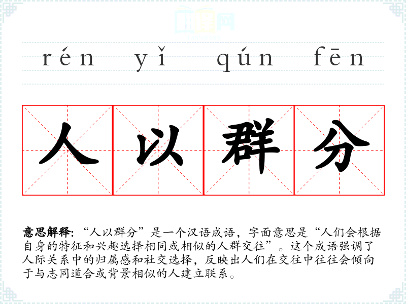 “人以群分”是一个汉语成语,字面意思是“人们会根据自身的特征和兴趣选择相同或相似的人群交往”。这个成语强调了人际关系中的归属感和社交选择,反映出人们在交往中往往会倾向于与志同道合或背景相似的人建立联系。