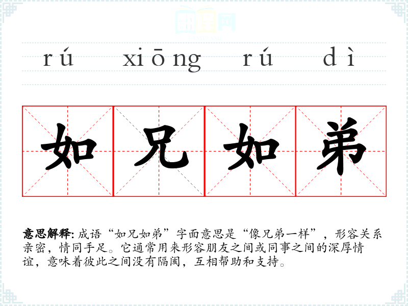 成语“如兄如弟”字面意思是“像兄弟一样”,形容关系亲密,情同手足。它通常用来形容朋友之间或同事之间的深厚情谊,意味着彼此之间没有隔阂,互相帮助和支持。