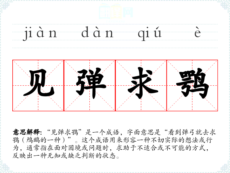 “见弹求鹗”是一个成语,字面意思是“看到弹弓就去求鹗(鸬鹚的一种)”。这个成语用来形容一种不切实际的想法或行为,通常指在面对困境或问题时,求助于不适合或不可能的方式,反映出一种无知或缺乏判断的状态。