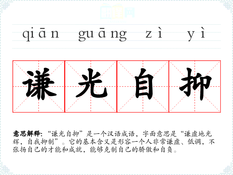“谦光自抑”是一个汉语成语,字面意思是“谦虚地光辉,自我抑制”。它的基本含义是形容一个人非常谦虚、低调,不张扬自己的才能和成就,能够克制自己的骄傲和自负。