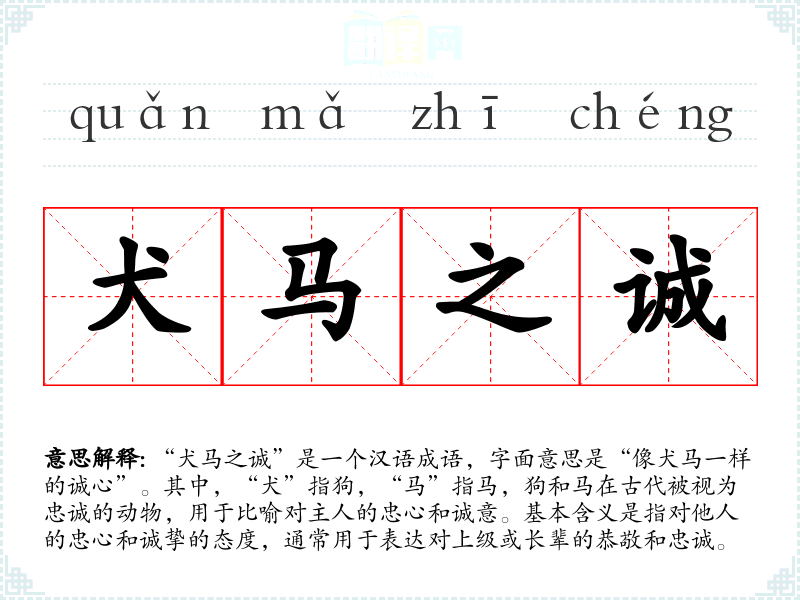 “犬马之诚”是一个汉语成语,字面意思是“像犬马一样的诚心”。其中,“犬”指狗,“马”指马,狗和马在古代被视为忠诚的动物,用于比喻对主人的忠心和诚意。基本含义是指对他人的忠心和诚挚的态度,通常用于表达对上级或长辈的恭敬和忠诚。