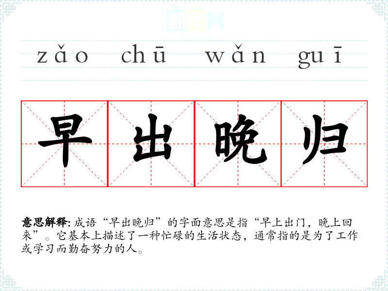 成语“早出晚归”的字面意思是指“早上出门,晚上回来”。它基本上描述了一种忙碌的生活状态,通常指的是为了工作或学*而勤奋努力的人。
