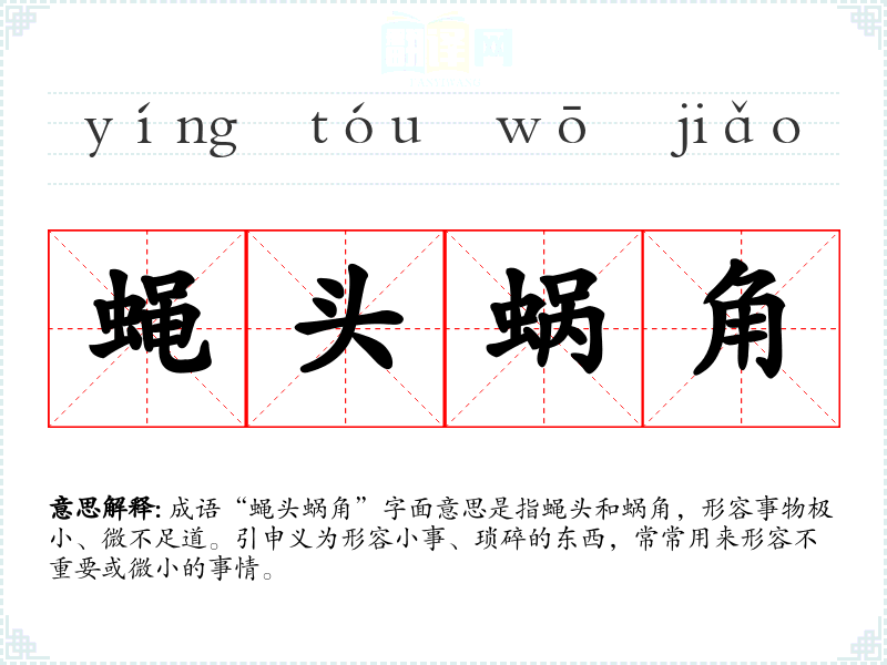 成语“蝇头蜗角”字面意思是指蝇头和蜗角,形容事物极小、微不足道。引申义为形容小事、琐碎的东西,常常用来形容不重要或微小的事情。