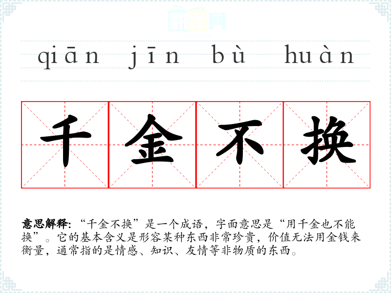 “千金不换”是一个成语,字面意思是“用千金也不能换”。它的基本含义是形容某种东西非常珍贵,价值无法用金钱来衡量,通常指的是情感、知识、友情等非物质的东西。