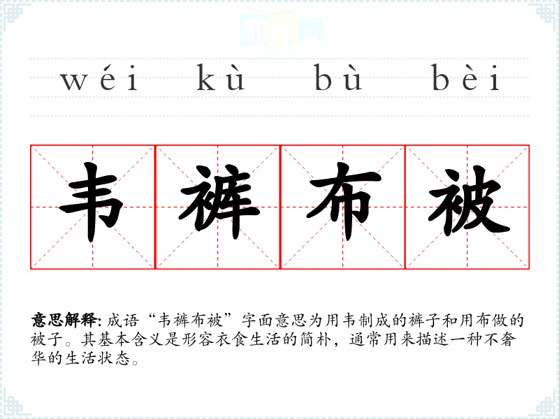 成语“韦裤布被”字面意思为用韦制成的裤子和用布做的被子。其基本含义是形容衣食生活的简朴,通常用来描述一种不奢华的生活状态。