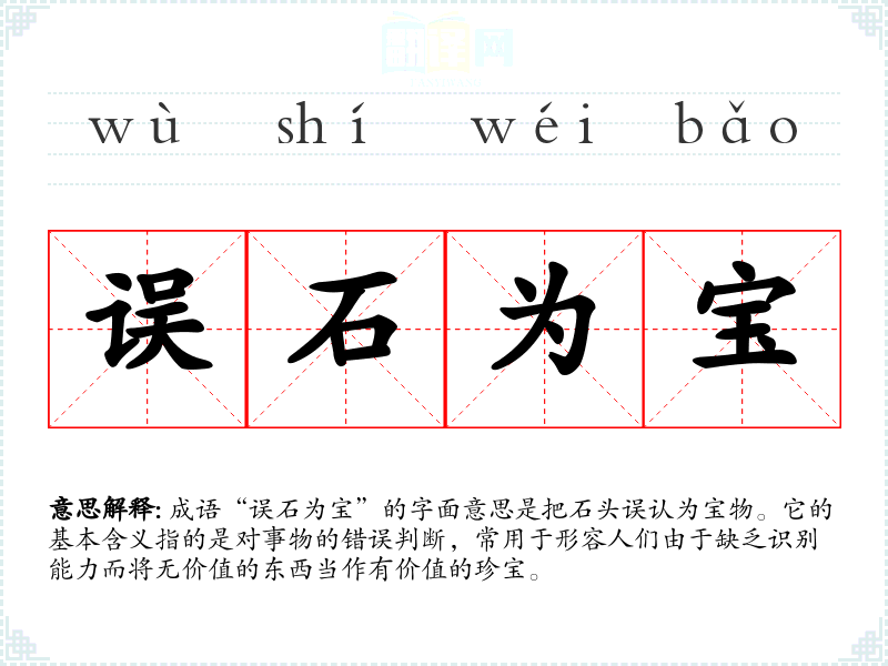 成语“误石为宝”的字面意思是把石头误认为宝物。它的基本含义指的是对事物的错误判断,常用于形容人们由于缺乏识别能力而将无价值的东西当作有价值的珍宝。
