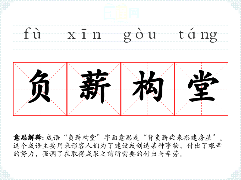 成语“负薪构堂”字面意思是“背负薪柴来搭建房屋”。这个成语主要用来形容人们为了建设或创造某种事物,付出了艰辛的努力,强调了在取得成果之前所需要的付出与辛劳。