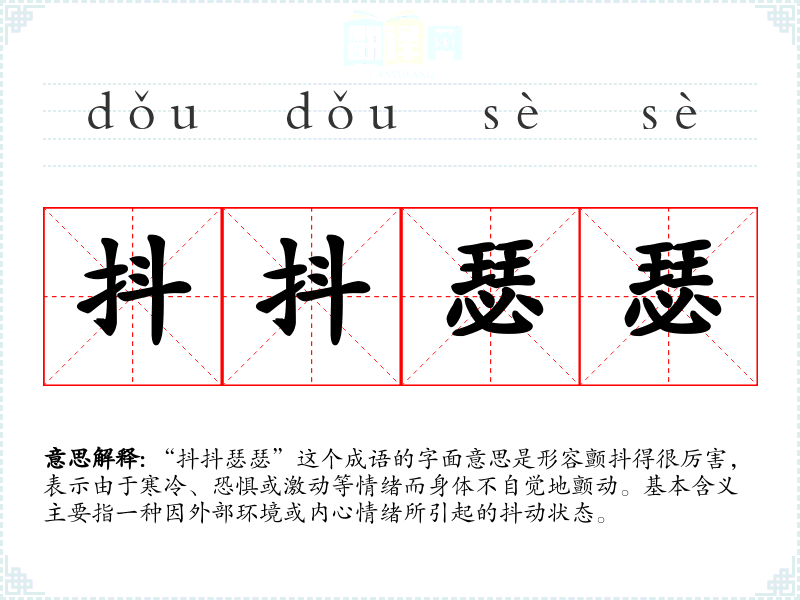 “抖抖瑟瑟”这个成语的字面意思是形容颤抖得很厉害,表示由于寒冷、恐惧或激动等情绪而身体不自觉地颤动。基本含义主要指一种因外部环境或内心情绪所引起的抖动状态。