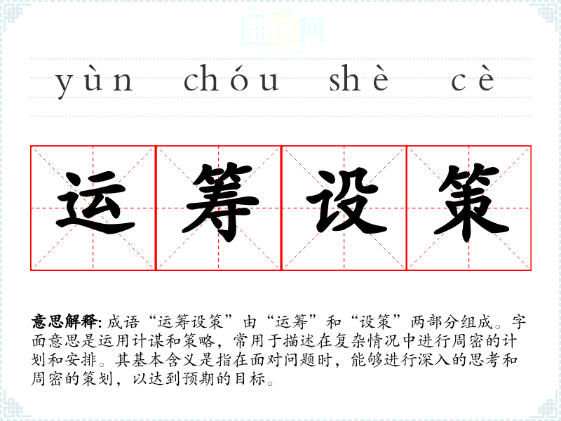 成语“运筹设策”由“运筹”和“设策”两部分组成。字面意思是运用计谋和策略,常用于描述在复杂情况中进行周密的计划和安排。其基本含义是指在面对问题时,能够进行深入的思考和周密的策划,以达到预期的目标。