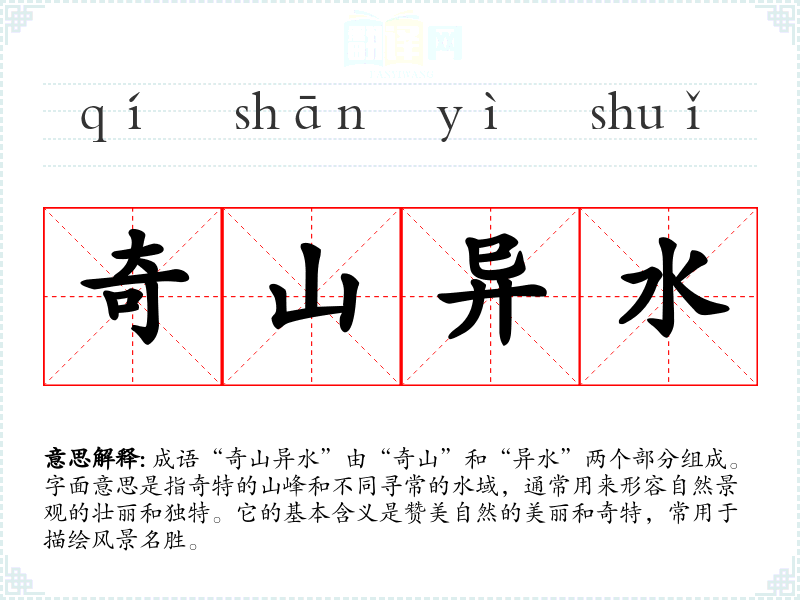 成语“奇山异水”由“奇山”和“异水”两个部分组成。字面意思是指奇特的山峰和不同寻常的水域,通常用来形容自然景观的壮丽和独特。它的基本含义是赞美自然的美丽和奇特,常用于描绘风景名胜。