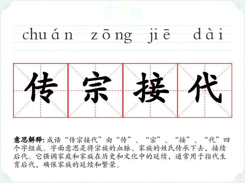 | 传宗接代 | 宗:宗教,家族。代:后代。传延宗教,接续后代。旧指生了独生子可以使家世一代一代传下去。 |