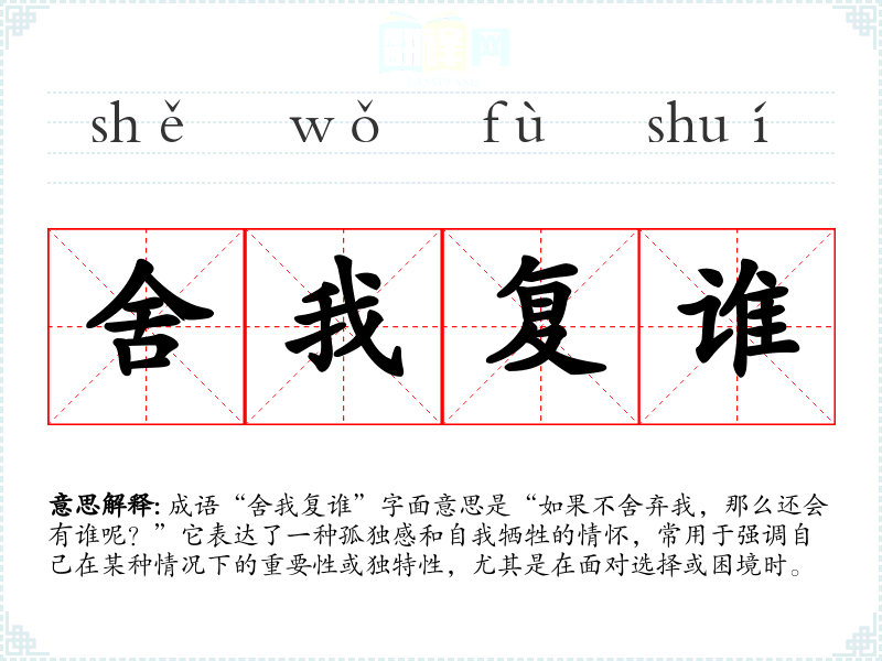 成语“舍我复谁”字面意思是“如果不舍弃我,那么还会有谁呢?”它表达了一种孤独感和自我牺牲的情怀,常用于强调自己在某种情况下的重要性或独特性,尤其是在面对选择或困境时。