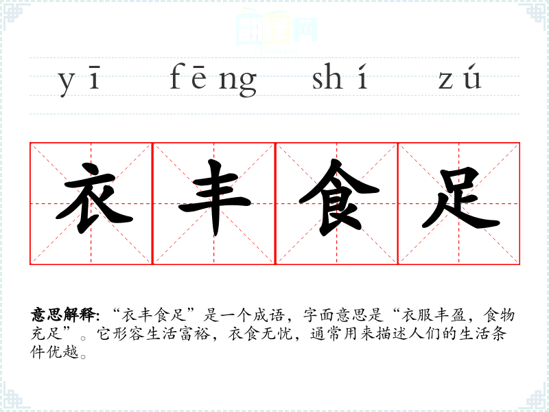 该成语的来源可以追溯到古代文献,主要表达了对富足生活的向往。在《左传》中,有关于生活富裕的记载,体现了古人对“丰衣足食”状态的重视。成语中的“衣”和“食”分别代表了人们生活的基本需求,强调满足这些需求的重要性。