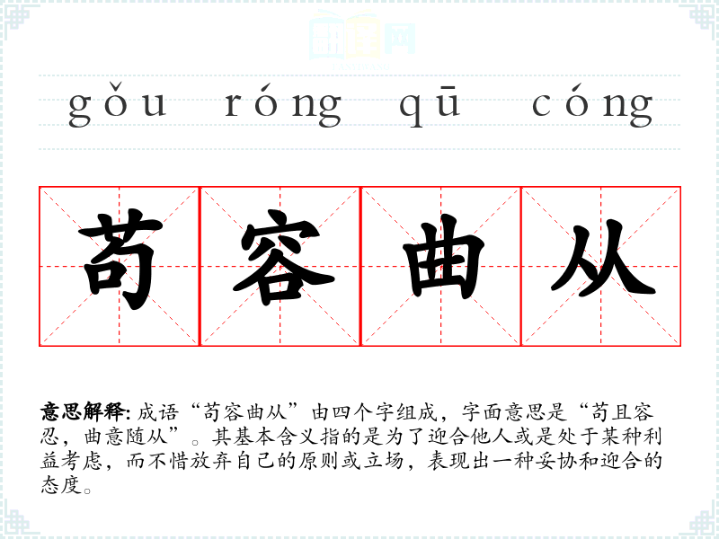 成语“苟容曲从”由四个字组成,字面意思是“苟且容忍,曲意随从”。其基本含义指的是为了迎合他人或是处于某种利益考虑,而不惜放弃自己的原则或立场,表现出一种妥协和迎合的态度。