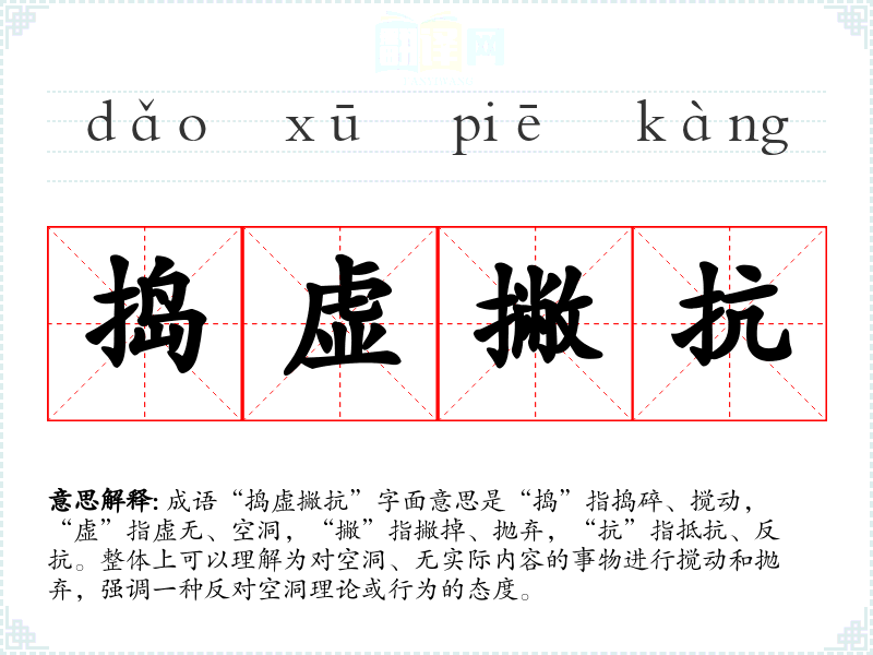 “捣虚撇抗”并不是一个常见的成语,可能源于对某些古代文献或民间故事的再加工。在传统文化中,常常存在对“虚”和“实”的讨论,强调实事求是,反对空谈。因此,该成语可以理解为一种对虚无内容的批判,类似于古代哲学中的一些观点。