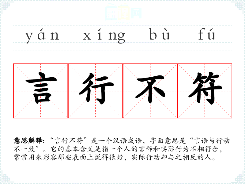 “言行不符”是一个汉语成语,字面意思是“言语与行动不一致”。它的基本含义是指一个人的言辞和实际行为不相符合,常常用来形容那些表面上说得很好,实际行动却与之相反的人。