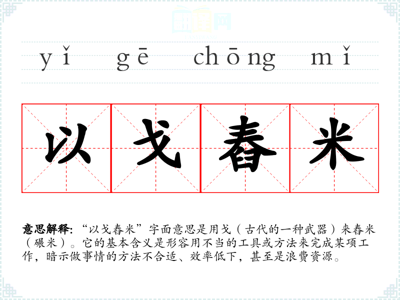 “以戈舂米”字面意思是用戈(古代的一种武器)来舂米(碾米)。它的基本含义是形容用不当的工具或方法来完成某项工作,暗示做事情的方法不合适、效率低下,甚至是浪费资源。