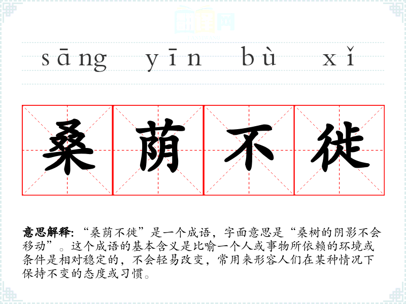“桑荫不徙”是一个成语,字面意思是“桑树的阴影不会移动”。这个成语的基本含义是比喻一个人或事物所依赖的环境或条件是相对稳定的,不会轻易改变,常用来形容人们在某种情况下保持不变的态度或*惯。