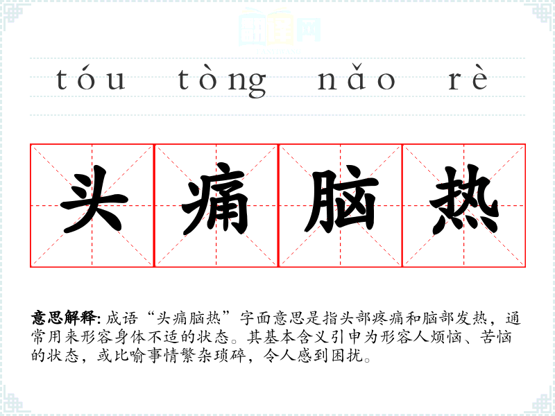 成语“头痛脑热”字面意思是指头部疼痛和脑部发热,通常用来形容身体不适的状态。其基本含义引申为形容人烦恼、苦恼的状态,或比喻事情繁杂琐碎,令人感到困扰。