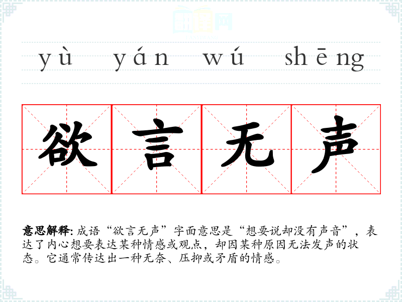 “欲言无声”并没有明确的历史典故或文学出处,但可以理解为一种普遍的心理状态,反映了人们在特定情境下的困惑与无奈。此成语的构成与“言”与“声”的对立,强调了言语表达与内心情感之间的矛盾。