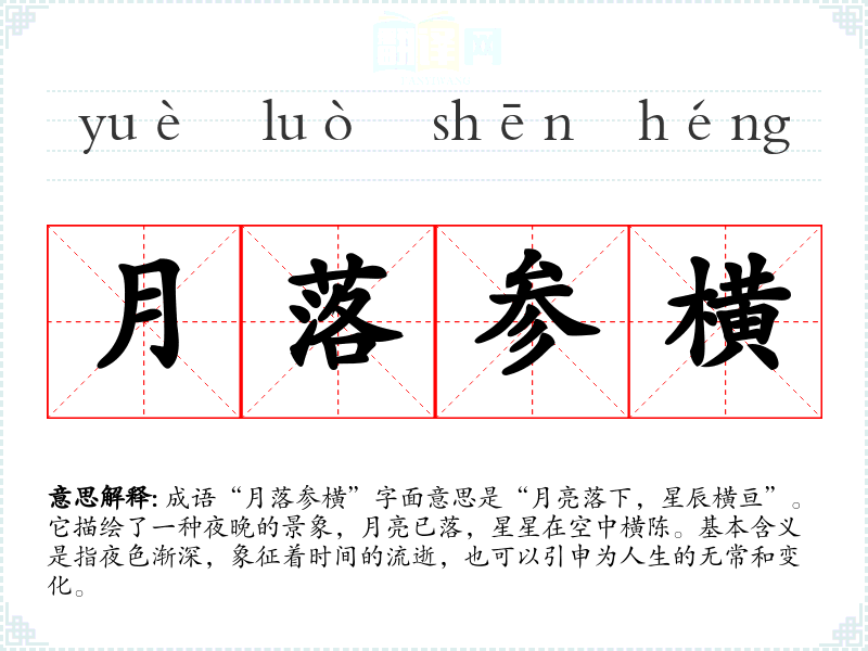 成语“月落参横”字面意思是“月亮落下,星辰横亘”。它描绘了一种夜晚的景象,月亮已落,星星在空中横陈。基本含义是指夜色渐深,象征着时间的流逝,也可以引申为人生的无常和变化。