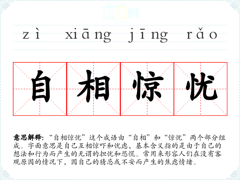 “自相惊忧”这个成语由“自相”和“惊忧”两个部分组成。字面意思是自己互相惊吓和忧虑,基本含义指的是由于自己的想法和行为而产生的无谓的担忧和恐慌。常用来形容人们在没有客观原因的情况下,因自己的猜忌或不安而产生的焦虑情绪。