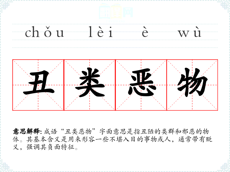 - 同义成语:丑陋不堪、恶性肆虐。它们都强调对丑恶事物的否定和厌恶。