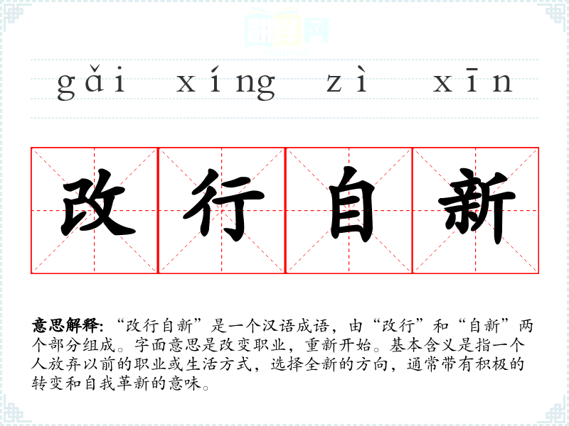 “改行自新”是一个汉语成语,由“改行”和“自新”两个部分组成。字面意思是改变职业,重新开始。基本含义是指一个人放弃以前的职业或生活方式,选择全新的方向,通常带有积极的转变和自我革新的意味。