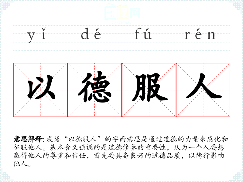 成语“以德服人”的字面意思是通过道德的力量来感化和征服他人。基本含义强调的是道德修养的重要性,认为一个人要想赢得他人的尊重和信任,首先要具备良好的道德品质,以德行影响他人。