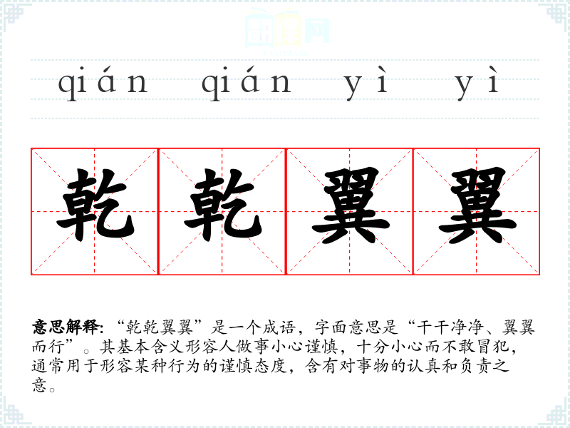 “乾乾翼翼”是一个成语,字面意思是“干干净净、翼翼而行”。其基本含义形容人做事小心谨慎,十分小心而不敢冒犯,通常用于形容某种行为的谨慎态度,含有对事物的认真和负责之意。