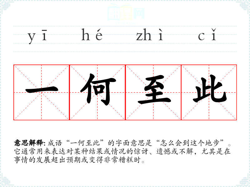 成语“一何至此”的字面意思是“怎么会到这个地步”。它通常用来表达对某种结果或情况的惊讶、遗憾或不解,尤其是在事情的发展超出预期或变得非常糟糕时。