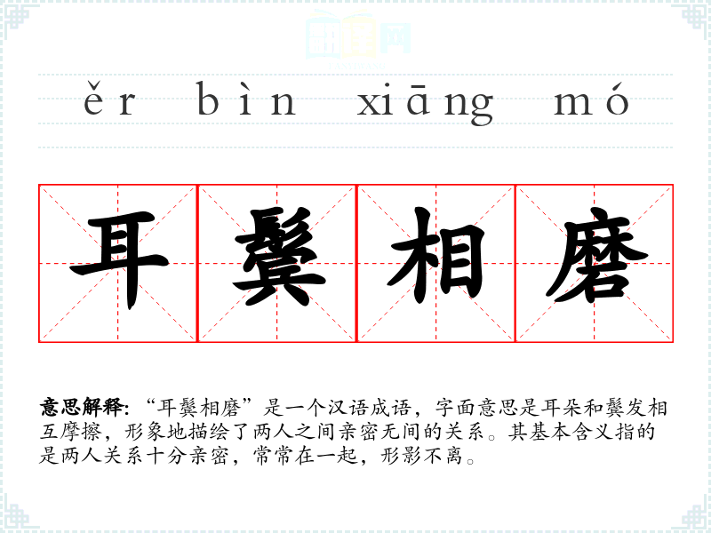 “耳鬓相磨”是一个汉语成语,字面意思是耳朵和鬓发相互摩擦,形象地描绘了两人之间亲密无间的关系。其基本含义指的是两人关系十分亲密,常常在一起,形影不离。