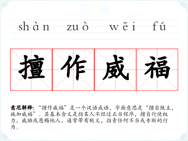 “擅作威福”是一个汉语成语,字面意思是“擅自做主,施加威福”。其基本含义是指某人不经过正当程序,擅自行使权力,威胁或恩赐他人,通常带有贬义,指责任何不当或专断的行为。